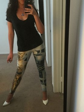 Кудрявая телка подошла к зеркалу и показала стриптиз в лосинах с принтом